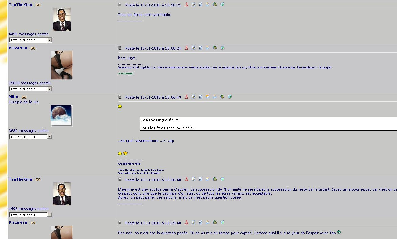 | Tao: Ase, explique à tout le monde pourquoi, dans un sujet qui est : le foetus humain est-il sacrifiable tu supprimes 1- Tous les êtres sont sacrifiable. 2- L'homme est une espèce parmi d'autres. La suppression de l'humanité ne serait pas la suppression du reste de l'existant. (avec un a pour pizza, car c'est un participe). Question posée à Atil en mp, au cas ou tu fasses comme d'habitude, dictateur d'opérette. Ase: Et toi quand tu enlèveras la merde de devant tes yeux tu me diras où vois-tu que ça a été supprimé pauvre naze ! Tu commences sérieusement à me saouler avec tes attaques personnelles, tes coups bas et ta puterie de TaoSpaiens.