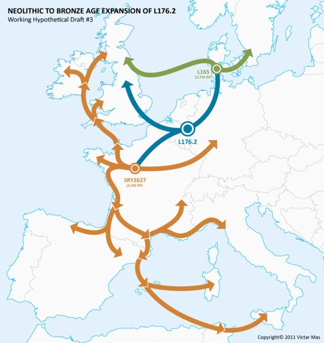| A noter que les Wisigoths Goths sages ou Goths de l'ouest, sont certainement venus au départ du Gottaland suédois (capitale Goteborg) . Actuellement la composition haplotypique du Gotaland (tests dans plusieurs provinces suédoises qui en font partie) est fait d'environ 3 tiers : - un tiers R1b-P312 et R1b-U106 comme l'Europe de l'ouest et la cote sud-ouest de la Norvège avec plus de 40% - un tiers I1-M253 comme la Suède centrale ou il atteint son maximum avec la cote sud-ouest de la Finlande. -un tiers R1a comme le sud de la cote baltique. Dans leur migration sur 5 siècles marquée par des étapes et des échanges avec des peuples alliés : Nord de la Pologne 1er siècle, Ukraine 2e siècle, Roumanie 3e siècle, Italie début 5e siècle, France du Sud Ouest d'environ 415 à 515 date de la bataille de Vouillé près de Poitiers remporté par Clovis), Espagne d'abord nord-est au 5e siècle puis progressivement toute l'Espagne jusqu'en 720 conquète musulmane, ils se sont d'abord enrichis en R1a et I2b-M223 puis I2a-M423, J2, E-V13 vers les Balkans et à nouveau R1b-P312 dans le sud-ouest de l'Europe . Il est toujours difficile pour ces peuples semi-nomades de savoir dans quel mesure ils se mélangent avec les populations voisines. Dire que c'est kif-kif n'est pas résoudre le problème car historiquement on sait qu'il y a de grosses différences suivant les peuples et aussi à différentes époques de leur histoire. Pour les Romains et les Francs, il suffisait de supporter la vue d'une lame tranchante brandie contre vous agressivement. D'autres peuples étaient plus fermés.