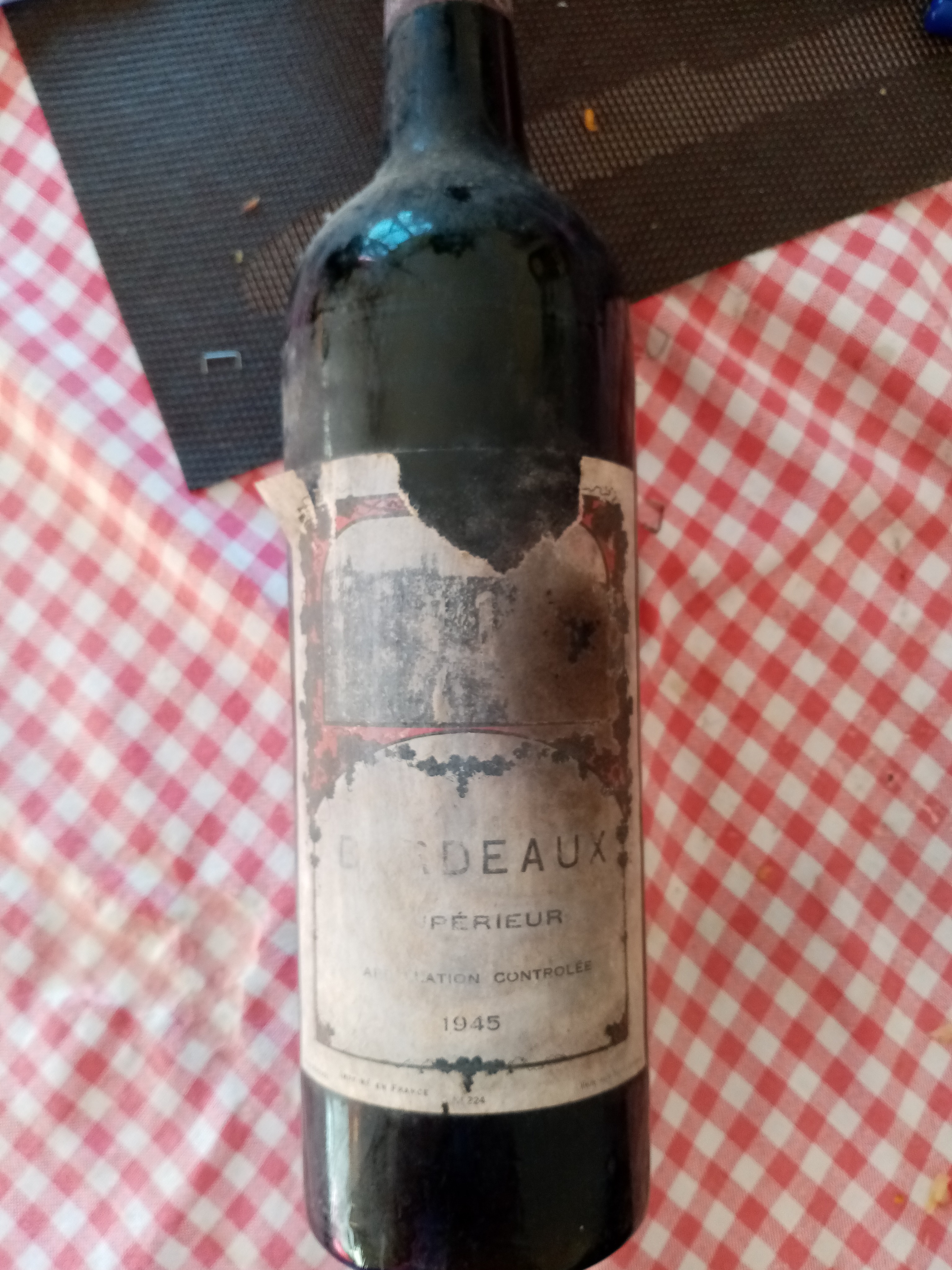 | Le bordeau on ne sait pas de quel domaine ça vient ?? l'année 1945 est une année très spéciale par contre en raison des conditions climatiques exceptionnelles neige abondantes d'abord puis avril très chaud après sécheresse = démarrage en flèche de la vigne puis gros gros gel du premier mai = peu de récolte puis c'est l'année du début de la guerre ce vin qui aurait du être exceptionnel aurait du être bon 50 ans plus tard après c'est dépassé n'as de valeur que pour les fous de collectionneurs à mettre aux enchères peut-être si un expert identifie un domaine qui aurait un grand nom comme laffite ou chateau yquem mais ce n'est pas le cas à mon avis ne monteras pas à plus de 30 /50 euros même pour un collectionneur