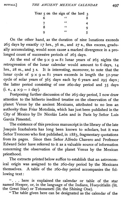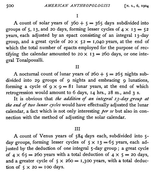 extrait de : "le monde azteque" de daniele delhouve-anne-marie vie-wohrer p 136 "le tonalpohualli et les autres cycles naturels" "...celle (la période synodique) de Venus est de 584 jours,...Il s'ensuit que 65 cycles vénusiens équivalent a 2 siècles mexicains et a 146 tonalpohualli et que les 3 cycles se réinitialisent simultanément : 65*584=104*365=146*260=37960 jours. Le nombre 260 s'adaptait aussi a la période synodique de Mars qui est de 780 jours,si bien qu'un cycle martien équivalait a 3 tonalpohualli (780=260*3). Enfin, l'intervalle moyen entre 3 éclipses solaires est de 173.3 jours, si bien que 3 éclipses équivalaient presque à 2 tonalpohualli (173.3*3=260*2) La coïncidence entre un jour du tonalpohualli et une certaine position solaire se reproduisait au bout de 73 tonalpohualli ; celle entre un jour du tonalpohualli et la position de Venus par rapport au soleil exigeait 146 tonalpohualli et celle entre un jour et la position de Mars demandait 3 tonalpohualli..." Je note, dans ce livre, une question qui me semble interessante concernant le nombre 260 : "Mais comment a-t-il été trouve ?" |