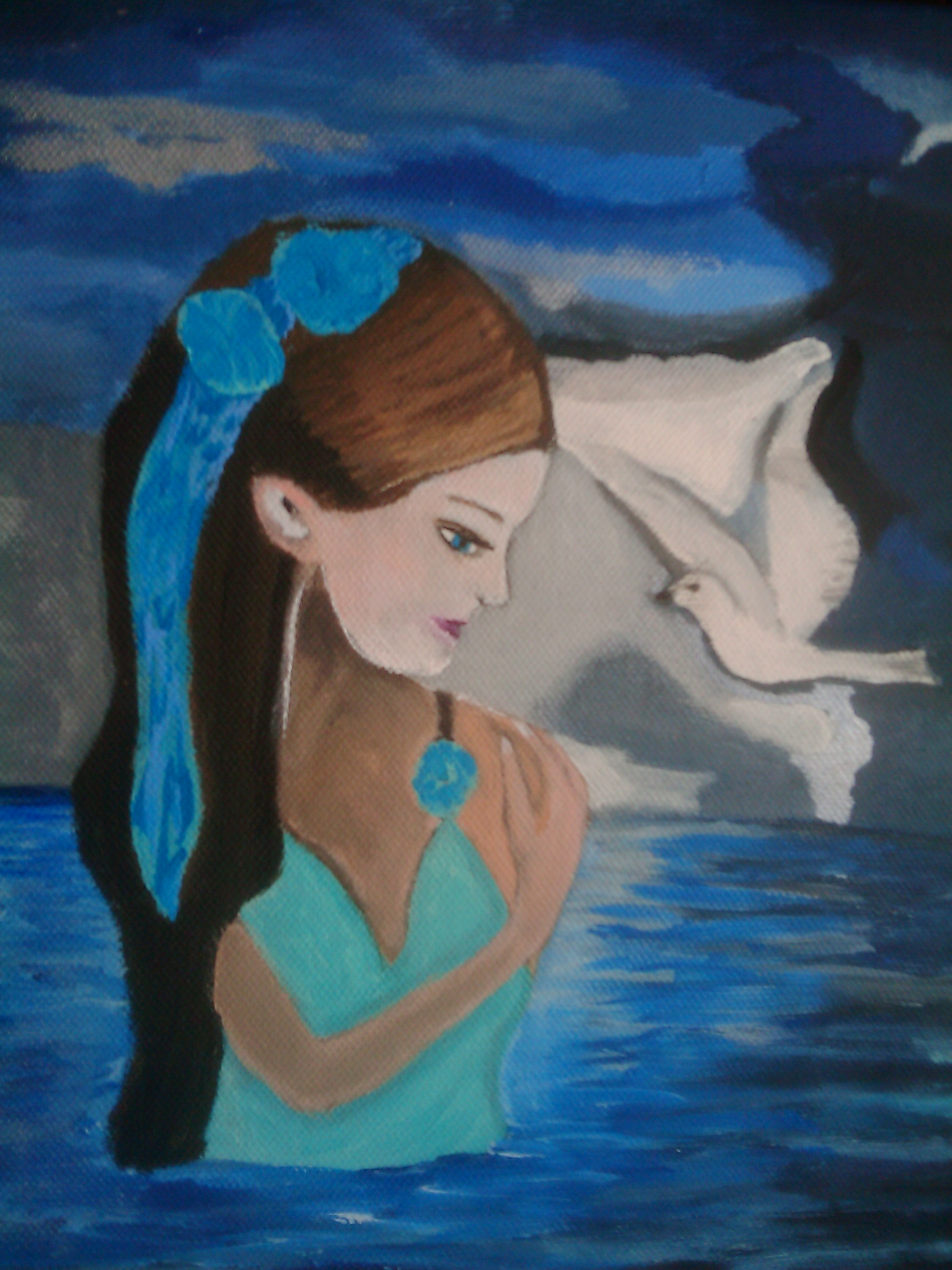 | j'aime bien le ciel mais au niveau de l'eau la couleur touche trop le dos alors que de l'autre côté il y a beaucoup de blanc. Sinon on sent que c'est une corvée pour toi de peindre les cheveux, passe y un peu plus de temps. Les cheveux sont un élément à la fois liquide (ondulation, mini vague sont des expressions de coiffeur par exemple) et à la fois aérien car au sommet du corps. En tout cas tu aimes beaucoup plus les ciels plus que l'eau. Intellectualisation au détriment de la sensualité?