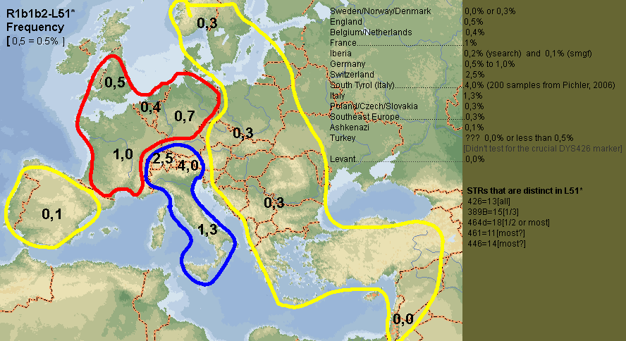 | Il me semble avoir lu cela quelque part mais avec une touche de pigment "Martiko" en plus. "on constate la totale disparition de L51 sur les regions ...', c'est de la sauce Martiko car les porteurs R1b1b2 d'Europe Occidentale portent tous la mutation L51, sont donc L51+ . Ce qu'ils ne sont pas est L51* en dehors de peut-etre le sous groupe DYS426=13 d'Italie(hypothèse Argiedude , auteur aussi de la carte L51* d'après son hypothèse). L51* sont les porteurs de la mutation L51, donc L51+, mais d'aucunes mutations postérieures P310-, P311-, P312-,U106-. Donc, les L51* existeraient en Italie, mais n'existent pas en quantité notable en dehors, Ils y existent les L51+ porteurs de mutations ultérieures, qui descendraient de L51* d'Italie qui ont a la fois migré et muté.
