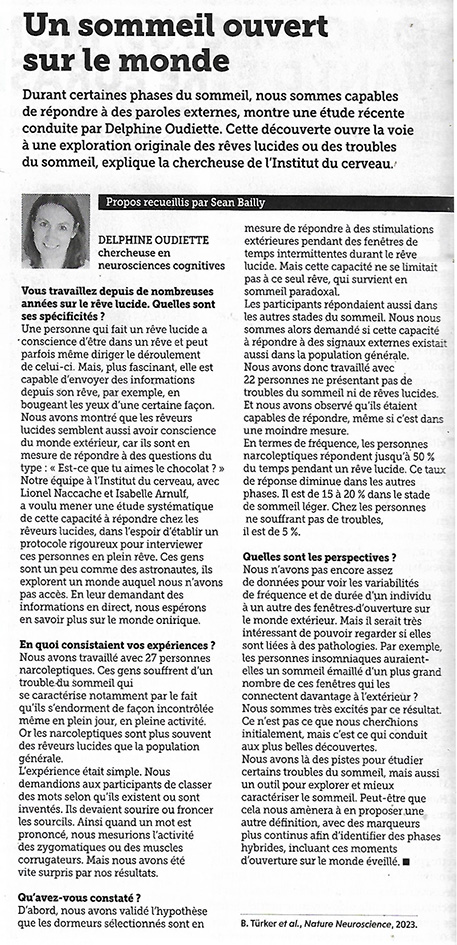 | Le 25 Novembre : Je vais me coucher à 22H30 et je m'endors rapidement... R1 : Quelqu'un m'explique qu'un homme qui va dans le monde des rêves peut nous en ramener quatre sortes d'indices : - Des traces de COVID. - Des traces d'une autre maladie. - Des traces de CODID et d'une autre maladie. - Des traces d'aucune maladie. ... J'entends ensuite une voix dire : "N° 4 rue Sambaqui !" Je me réveille. Il est 23H55. Je me rendors... R2 : Je repense au rêve R1... Je me réveille. Il est 1H30. Je veux noter mon rêve... et je me rends compte que je n'ai fait que répéter mon 1er rêve. Je me rendors... R3 : Un homme (Bruno, mon ancien patron ?) veut me montrer combien les gens peuvent se montrer bêtes et dociles comme des moutons. Il bouge des dossiers rangés dans les rayons d'une bibliothèque et ça sert de signal pour que des gens applaudissent. Je ne vois pas ces personne, elle doivent se trouver derrière la bibliothèque. Bruno s'amuse à toucher les dossiers comme si c'était des touches de piano, déclenchant à chaque fois un applaudissement différent. Je lui dis que c'est parce qu'il a payé ces personnes pour faire ça. Mais il m'assure que non : Il leurs a seulement demandé de l'aider à réaliser une expérience... Le rêve devient confus. Je ne suis plus son scénario mais j'examine comment le rêve est constitué. La bibliothèque (ou toute la scène) n'est plus placée verticalement mais horizontalement et je regarde si les dossier n'actionnent pas un système mécanique pour déclencher les applaudissements. Les dossiers dans les rayonnages se transforment en boules placées dans des cases. Je me dis que Bruno n'est pas gentils. Il pourrait payer ces personnes qu'il manipule. Il pourrait prendre des gens du Bangladesh. Les habitants de ce pays sont pauvres, ça les aiderait... Le rêve redevient normal et la bibliothèque est à nouveau disposée verticalement. Bruno continue à s'amuser à faire applaudir ses "esclaves". Je remarque que les vibrations font bouger les dossiers dans les rayons et qu'ils commencent à ressortir en penchant. Attention ! Tout va tomber sur nous ! Je me recule alors que tous les dossiers dégringolent... mais, tout au fond de moi, je sens que c'est moi qui ai décidé de ce dénouement dans le scénario. Je me réveille. Il est 2H55... HH1 : Des faux souvenirs traversent ma tête, voulant rajouter des passages supplémentaires à ce que je me souviens du rêve précédent. Il est 3H15. Je me rendors... R4 : Je marche dans la rue. C'est le matin et je pars pour toute la journée, probablement à mon travail. Peut-être même que je vais prendre le train. Je suis perdu dans mes pensées et je marche, je marche... Je passe devant mon ancienne école maternelle. Soudain je prends conscience que, depuis tout à l'heure, je suis en train de marcher dans la neige. Je n'avais même pas remarqué. Il a donc déjà neigé alors que nous sommes en Novembre ! Je remarque que je marche facilement comme si la neige était déjà tassée. Et il ne fait pas vraiment froid. Je tâte mes vêtements pour vérifier s'ils sont adaptés... et je me sens bizarrement léger. Quelque chose cloche... Je me rends alors compte que j'ai oublié d'emporter mon sac avec moi. Merde ! Je ne vais tout de même pas passer la journée sans mon sac, mon casse-croute était dedans ! Et je n'ai pas le temps de retourner le chercher chez moi. Que vais-je faire ?... Mais cette situation m'en rappelle d'autres, semblables, que j'avais déjà vécues dans des rêves... Bon, ben, tant pis si je modifie le scénario qui était prévu mais je vais devoir réutiliser la même méthode que les autres fois... Je claque alors des doigts et, immédiatement, mon sac à bandoulières se matérialise à mon épaule... Ben quoi ? Evidemment que je sais qu'on était dans un rêve. On ne va pas en faire toute une histoire !... Je ne me souviens pas d'une suite, j'ai du probablement basculer dans le rêve suivant en perdant ma lucidité... (...) R5 : Une sorte de moniteur m'a demandé de m'occuper de jeunes pendant son absence. Ceux-ci sont turbulents. Surtout deux skinheads qui se ressemblent comme des frères jumeaux : Cheveux blonds rasés et yeux bleus. Ils sont tellement semblables que le rêve finit par les fusionner en un seul personnage. Les jeunes sont dans la remorque d'un camion et le skinhead est parmi eux et insulte tout le monde. Je commence à en avoir marre de le voir aussi négatif et irrespectueux. Je lui demande donc de se calmer... mais il réagit en m'insultant grossièrement. Il dépasse les bornes alors je m'énerve vraiment. Je lui gueule dessus et lui dis que j'en ai marre de sa connerie et qu'il n'est qu'une merde. Je m'empoigne par les cheveux, ce qui n'est pas facile avec un skinhead, puis par les joues. Je lui pétris fortement le visage tellement j'ai envie de le broyer entre mes mains. Je voudrais le massacrer mais j'arrive à me contrôler.... A ma grande surprise il se dégonfle et s'écrase. Je remarque même qu'il a envie de pleurer. Son attitude arrogante n'était donc qu'une façade pour camoufler sa faiblesse. Je m'en vais et tout le monde me regarde avec respect. Le moniteur arrive, tout étonné... Je me réveille. Il est 5H00... HH2 : Dans ma cuisine, une femme aux cheveux blonds un peu courts me dit : "... La surface (?) des anneaux passe au premier plan (ou point) !" Je pense comprendre qu'elle veut parler des crochets au mur qui servent à accrocher des instruments de cuisine et qui ne tiennent plus tellement. Il est 5H50. HH3 : Dans ma cuisine une voix de femme dit : "Il y a deux bols de pour-ça !" et je vois un homme qui semble s'étrangler avec ce qu'il vient d'avaler. Il ressemble à l'acteur Philippe Duquesne. Il est 5H55. Note : Dans le rêve R4 je deviens lucide dans une situation récurrente (embarras par perte d'un objet et claquement de doigts pour activer mes pouvoirs). Mais je ne comprends pas pourquoi je me réveille aussi vite car je ne r