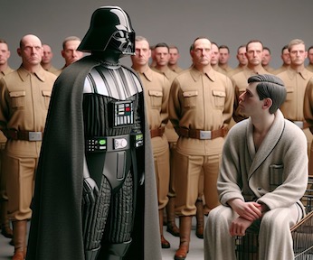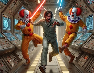 | Le 06 Avril : Je vais me coucher à 22H40 et je m'endors rapidement... R1 : Rêve oublié ... (...) R2 : Je fais venir dans ma chambre, en volant, la petite cage dans laquelle je transporte mes chats chez le vétérinaire. Puis je pose dessus un bout de tissus d'apparence métallique. Je me réveille. Il n'est que 23H20. Je me rendors... R3 : Je suis dans un bus. C'est, en fait, un décor virtuel en 3D que je suis en train de construire. Je fais apparaitre les barres servant aux voyageurs pour se tenir. Je suis content car ce n'est pas facile de créer des objets fins et allongés.... ... Je sors du bus et je me rends compte que celui-ci est devenu un grand vaisseau spatial. Je me trouve dans l'univers de film "Star wars" et j'assiste à une bataille entre les vaisseaux de l'empire et ceux des rebelles. J'apprends que ces derniers viennent de libérer ma planète alors j'en profite pour y aller. Je retrouve enfin ma maison... (... Ellipse ou séquence oubliée...) ... J'apprends que les troupes de l'empire ont contrattaqué et ont débarqué sur la planète. Je sors de ma maison et me dirige vers celle de mes voisins pour savoir s'ils ont l'intention de rester ou de s'enfuir. Devant chez eux je vois un grand écran vert qui flotte au dessus du sol. C'est un écran-téléporteur. Dedans je vois un extraterrestres (un homme-triton) en compagnie de mes voisins et de mes amis qui se sont réfugiés sur sa planète pour échapper aux combats. Je le remercie de les avoir évacué avec son téléporteur et d'accepter de les héberger sur sa planète. Je lui présente également mes excuses car, dans le passé, j'avais dit du mal de lui car je croyais qu'il était hostile aux humains. Je retourne chez moi... Et je vois que les troupes de l'empire sont déjà dedans. Je fuis de pièce en pièce pendant que les rebelles essaient de repousser l'attaque des storm-troopers impériaux. Mais ceux-ci parviennent à contrôler toutes les issues et je me retrouve bloqué dans la salle à manger, contre la grande fenêtre dont le volet est abaissé. Je ne veux pas être fait prisonnier alors que faire ?... Je me "souviens" alors que tout ceci n'est pas réel et que je ne suis que dans un rêve. A moins que ce ne soit une sorte de monde virtuel en 3D ? Je n'ai pas le temps d'éclaircir ma situation avec plus de précision car j'entends les storm-trooper qui se dirigent vers ma pièce. Je passe vite à travers la fenêtre, traversant facilement la vitre et le volet. C'est pratique de pouvoir faire le passe-muraille dans les rêves... même si je trouve que c'est un peu de la triche par rapport au scénario de cette histoire. Je descend vite les escaliers. En bas les rebelles et les storm-troopers s'affrontent sauvagement et, entrainé par le scénario, je perds rapidement ma lucidité... Je me dépèche de retourner vers l'écran-téléporteur pour fuir la planète... Mais il n'est plus là ! A l'endroit où il était je vois les troupes impériales cherchant des fugitifs. J'espère que l'extraterrestre a eu le temps d'éteindre son écran-téléporteur et que les storm-trooper n'ont pas eu le temps de s'en servir pour aller envahir sa planète... Je fais demi-tour et cours dans la rue, au milieu des combats. J'emprunte la rue Bertaux; c'est une rue si petite que les storm-troopers n'ont pas encore cherché à la contrôler. Puis je tourne à gauche et me retrouve dans un sentier de terre non-goudronné (ce sentier n'existe pas IRL). Devant moi je vois un groupe de cinq ou six femmes qui fuient les combats en emportant leurs enfants et leurs chats. Je me dis qu'elles ont de la chance d'avoir des chats disciplinés qui les suivent comme des chiens. Si j''avais voulu prendre mes chats avec moi j'aurais du les mettre dans des petites cages que j'aurais porté. Ca n'aurait pas été pratique du tout... surtout que j'ai sept chats ! Je rejoins les femmes pour fuir avec elles. Je "sais" que, dans l'avenir, quand l'empire aura été vaincu, ces femmes seront célèbres et que leur fuite par la rue Bertaud deviendra aussi mythique que la "longue marche" de Mao en Chine. Car ces femmes deviendront de grandes résistantes contre l'empire... (... Ellipse ou passage oublié...) ... Je me retrouve dans le "bus de l'espace" du début. C'est un vieil homme qui est en train de le reconstruire afin d'avoir un moyen de fuir la guerre sur cette planète. Je me réveille. Il est 3H15. Je fais quelques balayages oculaires. Puis je me rendors... R4 : ... Je suis toujours dans l'univers de "Star-wars" et j'ai été capturé par les terribles clowns de l'espace qui sont au service de l'empire. L'un d'eux me tient pendant qu'un autre va chercher une arme pour m'exécuter. Je crie : "Pitié, ne me tuez pas ! Je n'ai rien fait de mal ! Je n'ai fait que tuer quelqu'un qui profitait d'être au service de l'empire pour maltraiter la population !" (Je n'ai pas réellement peur; j'ai plutôt l'impression de prononcer un dialogue comme un acteur qui improvise)... Finalement les clowns me relâchent, je ne sais pas pourquoi... Je me dis, soulagé : "Cette scène n'était pas thétique... mais presque !" (copie du jeu de mots de l'humoriste Coluche qui disait "Ce mec n'est pas tibulaire... mais presque !"). Dans un haut-parleur j'entends que nous devons tous nous rassembler dans la grande salle d'embarquement et emporter du papier et de quoi écrire. J'y vais donc. Je vois tous les gens attendant debout au garde à vous car Dark Vador va venir nous faire un discours avant que nous embarquions dans un astronef pour une destination inconnue. Je me rends compte que je n'ai pas eu le temps de prendre de quoi écrire. Heureusement je vois, dans un coin, le petit caddie que j'utilise pour faire mes courses. Je vais le fouiller pour voir s'il ne contient pas du papier et un crayon... Puis je change d'avis : Je vais mettre le caddie contre un mur et je m'en sers comme d'une chaise... Soudain je me rends compte que je me suis assis à un mètre à p