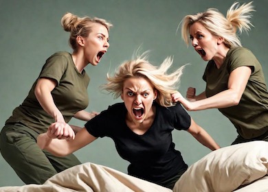 | le 17 Avril : Je vais me coucher à 22H25 et je m'endors rapidement... R1 : Ce rêve est plus perçu intellectuellement que vu vraiment en images. Je me trouve dans un grand fort médiéval. Des soldats viennent me rejoindre avec leurs grands chiens molosses. Ils lâchent ceux-ci dans la cour et ils se mettent à courir dans tous les sens en aboyant furieusement. Ils me font peur alors je vais me réfugier à l'étage supérieur qui est constitué d'un chemin de ronde longeant les créneaux. Je n'ose plus descendre et je me plains à ma cousine Carole que ces "animaux" occupent toute la place dans mon fort et m'empêchent d'accéder au rez-de chaussée et au "3ème étage" (probablement une sorte de cave). Ironiquement elle me répond : "Tiens, c'est bizarre car ils m'ont dit le contraire : Ils sont dans leurs fort et il y a un humain qui voudrait descendre pour prendre leur place !". Je n'apprécie pas sa plaisanterie et je fais ma tête. Je trouve anormal de devoir me contenter du petit étage supérieur alors que ces "animaux" occupent tout le rez de chaussée. Je me dis que je vais trouver un moyen de les téléporter loin d'ici avec mes pouvoirs car il est hors de question qu'ils prennent toute la place dans mon rêve !.. J'ai bien dit "rêve" mais j'ai prononcé ce mot de manière machinale sans vraiment penser à sa signification, et probablement l'ai-je dit par erreur à la place du mot "fort". Mais avoir prononcé ce mot semble avoir déclenché quelque chose en moi car tout semble de moins en moins réel autour de moi. Puis tout devient confus... et je me réveille... ... Ou plutôt je crois me réveiller car je me retrouve dans un faux-réveil. Je suis allongé dans mon lit dans le noir. Une information me traverse l'esprit : Il est 5H00 du matin. Déjà ? Et je ne me souviens d'aucun rêve ! Il me faut absolument des rêves car sinon je n'aurai rien à écrire dans le forum ! Je creuse au plus profond de ma mémoire ... ... Et je me réveille pour de bon. Il n'est que 1H15 et non pas 5H00. Je me rendors... R2 : J'explique à quelqu'un que le rêve précédent était difficile à retranscrire car il était "flou"... (... Ellipse...) ... Une sorte de film apparait devant moi. Je vois une femme (jouée par Victoria Abril) qui se retrouve à l'hôpital après avoir été renversée par une voiture. Là elle rencontre un homme dont elle tombe amoureuse... (... Ellipse ...) ... Je vois qu'on retourne des scènes de cette histoire, peut-être parce qu'on les trouvait trop dures. La femme semble maintenant blessés moins gravement, avec moins de bandages... Je me repasse la scène du début. Je vois la femme se promener dans une rue de ma ville lorsqu'une voiture beige au toit blanc arrive. Celle-ci va tyrop vite, négocie mal le virage et frôle la femme. C'est tout ? On n'a même pas l'impression qu'elle l'a heurtée ! C'erst nul ! La première version était bien plus crédible !... R3 : ... Je parle de l'espèce de film du rêve précédent à des amis. Une femme passe et leurs dit bonjour. Elle est brune, assez petite, avec des hanches un peu larges et porte une chemisette bleue ciel à manches courtes. Je ne sais pas pourquoi mais elle m'attire. Je décide que dans le scénario de cette histoire elle doit devenir ma petite amie (je sens confusément que je ne suis pas dans le monde réel et que c'est mon esprit qui crée tout ce qui m'entoure). Je l'empoigne alors et l'oblige à me suivre dans un coin de la pièce. Elle est surprise mais commence à s'énerver. J'effectue une rotation et me place le dos contre un angle de la pièce en plaçant la femme devant moi comme si c'était elle qui m'y avait coincé. Elle comprend alors quel rôle elle doit jouer dans ce nouveau scénario et elle se jette sur moi passionnément pour m'embrasser. Dans ma tête une voix me dit de me méfier car cette femme sera encore plus autoritaire et tyrannique que mes deux précédentes compagnes. Pourtant je me souviens d'avoir eu qu'une seule compagne dominatrice . Je la regarde et je trouve qu'elle n'a pas l'air tyrannique. Mais si je me trompe je me sens capable de la dominer puisque j'ai été prévenu. Et si je n'y arrive pas alors j'utiliserai mes pouvoirs pour changer le scénario de cette histoire. Je suis surpris d'avoir dit ça... et je me rends progressivement compte de l'irréalité de tout ce qui m'entoure... ... Mais je me réveille au lieu de devenir lucide. Il est 2H45. HH1 : Je demande à deux hommes de me suivre car, dans la suite du scénario, ils doivent être avalés par lma grande horloge qui est tombée amoureuse d'eux. Il est 3H25. HH2 : Les deux hommes sont devenus deux femmes. Je me dis que le changement du scénario a été trop brutal et que les gens risquent de ne pas comprendre. Il est 3H35. Je me rendors. R4 : J'ai besoin d'une feuille de papier pour écrire alors j'arrache un bout de papier peint au mur prés de mon armoire. C'est une drôle d'habitude que j'ai prise. Mais je vois que j'ai pris un trop grand bout alors je veux le recoller. mais je constate que la forme du bout de papier peint ne correspond plus à la forme du trou que j'ai laissé. (...) R5 : ... Je suis parvenu à recoller le bout de papier peint. Je suis content car cette affaire me chiffonnait. Je repense alors à une chose que j'avais entendue : Quand on perd son équilibre, on ne doit pas essayer de faire aller son corps dans le sens contraire de la chute mais, au contraire, le faire aller dans le même sens. Ainsi on a une chance de parvenir à rétablir ensuite son équilibre. (Je confond avec le conseil qu'on donne, IRL, aux conducteurs dont la voiture glisse sur du verglas.) J'essaie... et ça ne marche pas. Je me réveille. Il est 5H00. HH3 : Je suis sur un marché aux esclaves. J'ai envie de refaire un essai avec la méthode dont parlait le rêve précédent. Alors je pousse un esclave pour le faire tomber. Il est 5H25. HH4 : Je suis au fart west. J'ai envie d'essayer de jouer du kazoo. M
