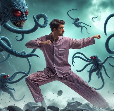 | Le 25 Juin : Je vais me coucher à 22H15 et je m'endors vite... R1 : Je me bats au kung-fu contre des monstres munis de tentacules. Ils sont nombreux mais je me sens très fort et j'arrive à repousser leurs assauts... ... Je me réveille (ou plutôt je crois me réveiller, je suis donc dans un faux-éveil). Je me souviens de mon rêve. Je suis fier de mon combat alors je me repasse plusieurs fois mon rêve dans ma tête pour bien le mémoriser. Je veux même l'enregistrer comme si mon cerveau était un enregistreur de vidéo. A force de le répéter je remarque que je peux en changer les angles de vue et même le déroulement du scénario en modifiant les paramètres mentaux... Finalement je décide de téléphoner à une sorte de professionnel pour qu'il vienne faire un enregistrement propre et sérieux de ce rêve. Je veux qu'il procède à un vrai montage comme si c'était une vidéo. R2 : Je suis Assis sur mon lit avec des amis et nous bavardons sur je ne sais plus quel sujet (Peut-être sur le contenu du rêve R1 ?). J'observe mon lit plus en détail et je me rends compte qu'il est immonde :Il est recouvert d'une vieille toile usée et crasseuse qui me fait honte. A un endroit je vois une grande tache comme si du liquide avait été versé dessus. Cette tache est centrée sur un creux. C'est probablement là que le liquide s'était accumulé puis s'était évaporé. Par association d'idées ce creux me fait penser à un vieux lac asséché. Et j'entends une voix qui m'explique que, au haut moyen-âge, les moines parlaient d'un grand lac qui occupait le centre de la Bretagne. On l'appelait le "LACUS FOETIDUS" c'est à dire le "Lac fétide" tellement ses eaux sentaient mauvais.Ce las s'est asséché depuis et il n'existe plus... (... Ellipse ou passage oublié...) ... Un homme s'approche de mon lit. On dirait le comédien Michel Blanc. Il voit un pot abandonné sur la couverture et ilme dit : "Ho ! Vous avez mangé du yaourt ?". ca semble lui faire envie. mais je lui réponds : "Oui mais il n'en reste plus !". Je me réveille. Il est 3H30. Je n'arriverai plus à me rendormir. Note : Je dors peu en ce moment. Il fait trop chaud et je pense trop à mes problèmes financiers.