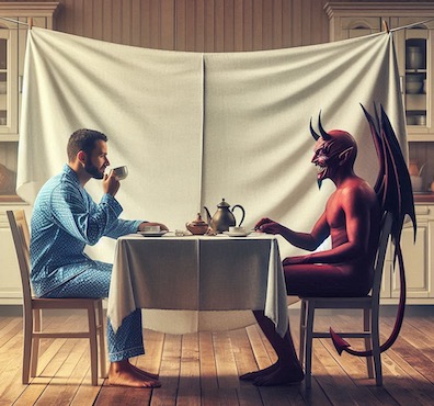 | Le 20 Juillet : Je prends du Hericium, vais me coucher à 22H35 et m'endors vite... R1 : Je suis chez moi à table avec le diable que j'ai invité à manger ou à prendre le thé. Il remarque que la salle à manger est séparée de la cuisine par un petit rideau posé sur un fil à linges tendu à travers la pièce. Je lui explique que, avant, il y avait un bien plus grand rideau qui s'étendait du sol au plafond mais comme il m'avait été offert par le Rassemblement National, on m'a poussé à l'enlever. Il me fait remarquer que c'est gênant car, quand je veux faire du HC avec une femme dans la salle àmanger, des gens situés dans la cuisine peuvent voir tout ce qui se passe.,Je lui réponds que je ne possède pas assez d'argent pour me racheter un rideau plus grand. En disant ça j'espère lui faire pîtié pour qu'il m'en offre un. Je me réveille. Il est 1H00. Je me rendors. R2 : ..... Je crois me réveiller. Je suis donc dans un faux-éveil (Il est probable que je suis en sommeil lent NREM car ce rêve est constitué surtout de pensées sans images). Je pense qu'il va être l'heure de me lever. J'écoute les bruits de la rue... mais je n'entends aucune voiture passer. Je me suis donc trompé :On est encore en pleine nuit. Je repense au rêve précédent et je me demande si je l'avais bien noté dans mon carnet... Je réfléchis... et je me souviens que je l'avais effectivement bien noté... (...) R3 : Je suis probablement en sommel REM car plus d'images apparaissent. Je repense à nouveau au rêve R1. C'était tout de même étonnant que j'aie pu inviter le diable chez moi. Mais je me souviens : C'est parce que je possédais un poteau-totem magique me permettant de réaliser tous mes souhaits. Je me vois dans ma cuisine le tenant dans mes mains : C'est un gros poteau vertical d'environ 1,50m de long. Il est blanc, flou et entouré d'un halo de lumière bleutée. L'ennui c'est que les gens sont au courant et que tout le monde a envie de me le voter. Je dois donc l'emporter toujours partout avec moi pour le surveiller. Je me vois me promenant dans la rue de l'école maternelle en le tenant. Ce n'est pas pratique. Je me vois ensuite près d'une rivière. Si je veux me baigner alors je dois le faire avec mon totem. Ce n'est pas pratique. Puis je me vois près de ma salle de bain . Si je veux me laver je dois aussi prendre le totem avec moi. Ce n'est pas pratique. Mais je pense à une solution : Il me suffit de ne plus me laver ! Mais je ne renonce pas à la propreté pour autant. Je tiens le totem à deux mains devant moi et je me concentre sur mon souhait d'être débarrassé de toute saleté... Une une grande vibration parcourt alors mon corps... et me voilà devenu propre sans avoir besoin de me laver. Pratique ! Je me réveille. Il est 5H10. Note : Le Hericium commence son effet car je suis parvenu à me souvenir du cheminement de ma pensée en sommeillent NREM. Par contre je trouve que le nombre total de rêves mémorisés est bien faible.