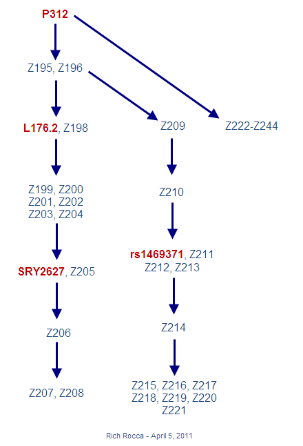 Regarde mieux ! Disons que c'est dans le mème sous-clade correspondant à un nouveau noeud Z195,Z196 premier niveau sous P312 mais plusieurs niveaux au-dessus de SR2627 et M153. Je ne sais pas si la découverte de nombreuses mutations menant de P312 aux extrémités des branches peut indiquer quelque chose sur l'age de P312 qui va actuellement de 5000-6000 ans (chronologie la plus courte le liant au développement du Campaniforme) à 15000-20000 ans le liant au post-LGM donc une mutation vers le dernier maximum glaciaire, hypothèse la plus réaliste à mon opinion.