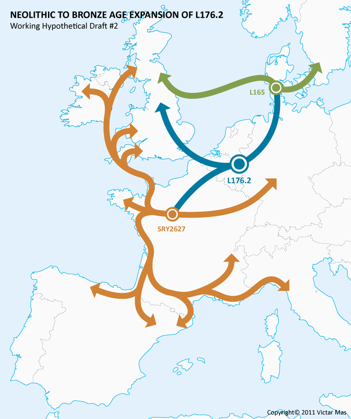 | effectibement il semble que le scénario migratoire se soit ainsi déroulé, on vient de découvrier tout une série de subclades dont beaucoup concernat les gallo-britannique R1b/L176.2 et SRY2627 et sont proche cousin gaélique R-L21 donc Z205 subclade parmi basques et gallois. Il s'agit notamment de aussi de préciser que R1b (R1a2 pour certain) et surtout sont subclade R1b1b se transforme en R1b1a2 rien ne change sinon la façon de classer car il y a actuellement une véritable petite guerre de position sur ce marché entre l'américan 23andME et suisse-americain FTDNA.