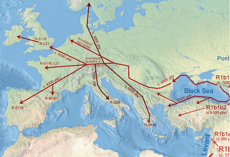 | on connait pour la branche germanique de maière claire : L11 est arrivé en Europe de l'ouest en remontant le Danube jusqu'en Suisse. Puis L11* est remonté en Hollande en descendant la vallée du Rhin. U106 aurait émergé en Hollande. Mais pour le celtic P312 on ne connait pas bien le les lieux ni la chronologie dans la géographie. Il faudra admettre que les wascons (majoritairement SRY2627)ne sont pas les originaires de ces régions, et il faudra prouver que la langue basque n'est pas IE autrement qu'avec des arguments raciaux et ce qui était le cas , et admettre que la vérité ne se trouve pas dans de vieilles bibles sinon on en viendra au créationnisme que je trouve très new-âgeux, et il serait très intéressant de s'intéresser aux ibères et à leur langue vraiment non IE qui étaient les véritables autochtones de l'aquitaine.