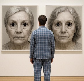 ... Je me trouve à présent avec l'inconnu dans une pièce aux murs gris clair sur lesquels sont exposés des agrandissements de photos. La première représente le visage de ma grand mère maternelle. Elle a une curieuse tache noire entre les deux yeux. Et ceux-ci sont très ronds et très noirs. Les photos suivantes représentes des visages d'autres femmes avec les mêmes caractéristiques bizarres. Ce doit être un logiciel qui a fait ça...