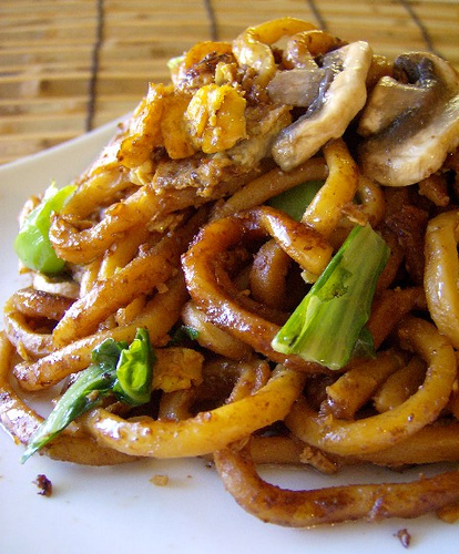Ingrédients : 1/2 paquet de nouilles jaunes bien épaisses 1 cuillérée à thé d'ail émincé 1/2 chou chinois 2 oignons verts émincés 4 champignons communs 1 oeuf 1 cuillérée à table de sauce au poisson 3-4 cuillérées à table de sauce soja 1-2 cuillérées à table de sucre brun 1 cuillérée à thé d'huile de sésame 1 cuillérée à thé d'huile de cuisson poivre blanc Méthode : 1) Faire bouillir les putains de nouilles jusqu'à la texture désirée, environ 5-8 minutes. Retirer puis rincer à l'eau froide, drainer puis laisser refroidir. 2) Ajouter les nouilles et l'huile dans un wok ou une poêle à frire. Bien mélanger. 3) Faire chauffer le wok ou la poêle jusqu'à ce qu'une mince fumée soit visible. Baisser le feu. Rapidement, ajouter et mélanger les oignons verts et l'ail jusqu'à ce qu'ils dégagent leur parfum. 4) Mélanger un oeuf, mélanger avec le chou chinois, les champignons tranchés, puis remettre le feu à «haut», en continuant de bien mélanger pendant une minute. 5) Ajouter les nouilles, éclabousser les avec la sauce au poisson, le sucre, la sauce soja, le poivre blanc, et continuer de bien mélanger pendant 2 ou 3 minutes aditionnelles jusuqu'à ce que le tout soit bien mélangé.