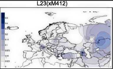 Les fortes concentration de R1b-L23 ancêtre de R1b/L11 ne sont pas à l'origine du néolithique (Proche Orient), mais au nord du Caucase et au nord de la mer d'Aral et de l'Altaï. |
