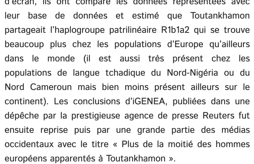 | (On notera que les Tchadiques, c'est à dire les Haoussas, parlent aussi une langue afro-asiatique. C'est un peuple apparenté aux Berbères qui a quitté le Sahara pour aller s'installer plus au sud et se métisser avec les noirs. " D’après les études d"ADN commandées par l'ancien directeur des Antiquités égyptiennes Zahi Hawass, toute la famille de Toutankhamon, et Akhénaton était d'origine européenne et d'haplogroupe Y-ADN R1b. De même si l'on regarde, ne seraient-ce que les momies des pharaons. Séthi 1er, Toutmôsis II ou Ramsès III, l'on n'a plus aucun doute sur leurs caractères physiques "caucasiens" Aussi, il nous apparait, que Fehmi Krasniqi, affecte un air bien désintéressé pour nous faire passer son message afro-centré d'Egyptiens noirs, et civilisateurs, digne du Cheik Anta Diop (décédé en 1986). L'ADN des Momies égyptiennes (Y-R1b1a2, et mt-T, R et U) est plus proche des Européens de l'ouest actuels que des actuels égyptiens. "