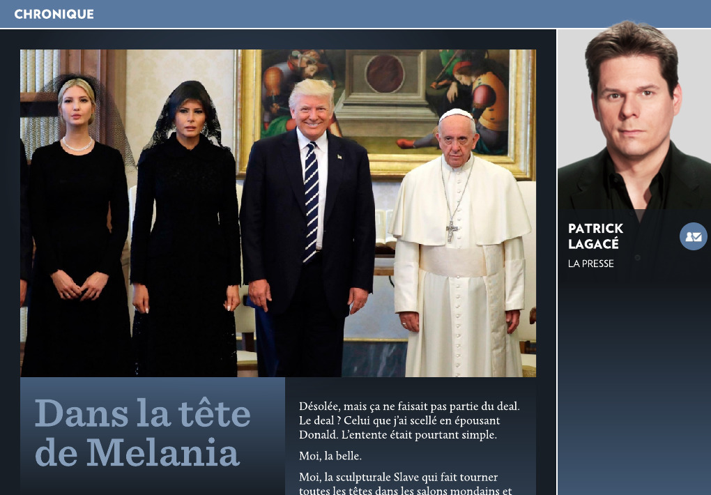 | UN BON GÂTEAU Ça fait 100 jours que le Grand Orange a été élu. Avouez qu’on ne s’ennuie pas une seconde. On ne sait jamais ce qu’il va dire ou ce qu’il va faire. C’est comme une boîte à musique: tu tournes la manivelle et hop! le clown surgit brusquement. Ce qui est déstabilisant est que cet homme n’a aucune idéologie, aucune grille d’analyse prédéterminée. Il peut faire telle chose comme il peut faire tout le contraire. On dirait qu’il se lève, le matin, et qu’il joue à pile ou face. Avez-vous entendu l’entrevue qu’il a accordée à Maria Bartiromo de Fox News concernant sa décision de frapper la Syrie? Hallucinant... «J’étais assis à la table avec le président de la Chine, on venait de terminer le repas et on était arrivé au dessert. «On avait le plus beau gâteau au chocolat au monde, magnifique, le plus beau que vous ayez vu, le président Xi Jinping se gâtait, et je lui ai dit: “Vous savez, je viens de lancer 50 missiles sur la Syrie”, et il m’a dit, en mangeant son gâteau: “Ah c’est parfait, c’est parfait”...» Il a aussi dit qu’après avoir écouté le président chinois lui parler de la Corée du Nord pendant 10 minutes, il s’est rendu compte que la situation était plus compliquée que ce qu’il pensait... Duh! LE JARDINIER Je pense souvent au film Being There quand je vois Trump. Le jardinier simple d’esprit qui devient président des États-Unis. À force de nous mentir et de nous fourrer, les politiciens d’expérience ont creusé leur propre tombe et ont permis qu’un gars comme Trump prenne le pouvoir. Ils n’ont qu’eux-mêmes à blâmer.