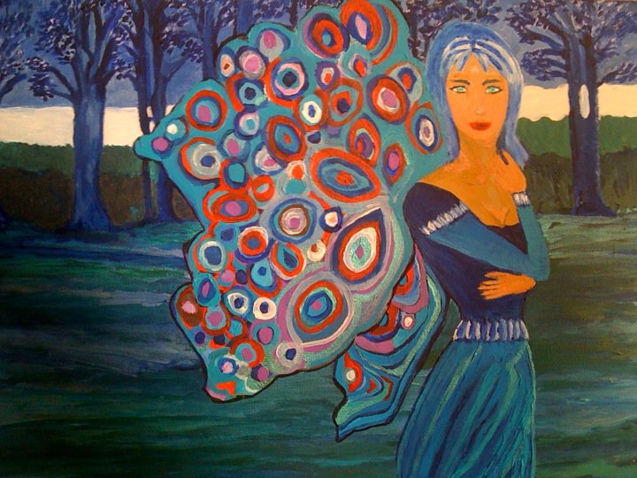 | C'est d'inspiration Gauguin ou je me fais nonne. J'aime pas du tout cette femme avec ses ailes dont le contour est noir, comme collé, et son air de tombeuse qui se prend pour une femme fatale. Franchement moche.